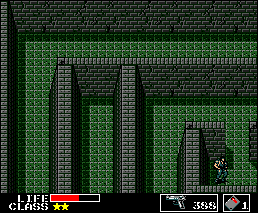 移動します。画面左の中央の壁に向かってパンチすると通常のパンチと音が違うので、プラスチック爆弾で壁を壊し、中に入ります。『ユニホーム』を手に入れ、外に出ます。(もしプラスチック爆弾がなくなってしまった場合には、下のテキスト『■ビル1 2F』をお読みください。右上のエレベータから取りにいけます。)下へ1画面戻ります。今度は上側の右の壁をパンチするとやはり違う音がします。ここもプラスチック爆弾で同様に壊します。道なりに、右に一画面、上に一画面行きます。 行き止まりの左の壁を同様にパンチして場所を確認し、プラスチック爆弾で左の通路から下へ進みます。道なりに上に行って、右が行き止まりになっているところの直前の画面(右の画像を参照)で下の壁をプラスチック爆弾で開けて、右へ行きましょう。 下に行くと、左のドア(カード3)で『ボム・ブラスト・スーツ』を手に入れます。これでここのエリアは終了です。右上にエレベータがありますので、犬に気をつけて、道なりに戻ってエレベータに乗り、2Fへ進みます。