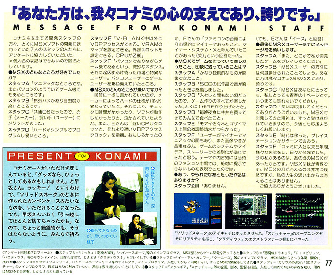 Minor System X様よりいただきました。MSX FANという雑誌(1995年6月号)の特集で、コナミがMSXソフトのマーケットから撤退した際の、制作スタッフへのインタビューです。あの方も『スタッフF』として登場しています。