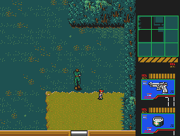 ■沼 沼は一本道ですが、沈まないよう操作してマップ右上の施設まで行きます。カード2で施設へ入リ、上のドアをカード1で入ると、ボス(RUNNING MAN)が登場します。RUNNING MANは攻撃はしてきませんが、ガスマスクを装備しないと毒ガスにやられてしまいます。(ゲームオーバーになるともう一度沼からやり直さなければなりません。またRUNNING MANとの戦闘中はレーションを装備していても自動で回復しないので注意しましょう。)RUNNING MANは移動するルートがだいたい決まっているので、その通路の真中に地雷を置きながら追いかけるとRUNNING MANが移動してダメージを受けます。8〜9発で倒せます。倒すとカード3が手に入ります。入り口右の部屋(カード3)で子供からスティンガーのありかを聞いて、ザンジバービルへと戻ります。