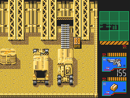 ■砂漠地帯 1Fへ戻り、マップ上部からビルの外へ出て、迷いの森からマップ上の砂漠地帯へ進みます。ここは歩く音がする砂、鳴り子の砂が敷かれていますので、敵兵士に注意しながら上に進んで下さい。(トラックの中には弾薬があります。)マップ上部でハインドDと遭遇します。ハインドDの影が画面上に来るとダメージを受けます。黄色い障害物の中に隠れながら、もしくは画面の隅にいるようにして画面をすばやく切り替えながら、先ほど手に入れた対空ミサイルを装備して攻撃します。4発で倒せますが、外せるのは2発までです。(対空ミサイルを使った後、装備を解除しないとスネークを操作できないので注意して下さい。)ハインドDを倒したら上へ向かいます。